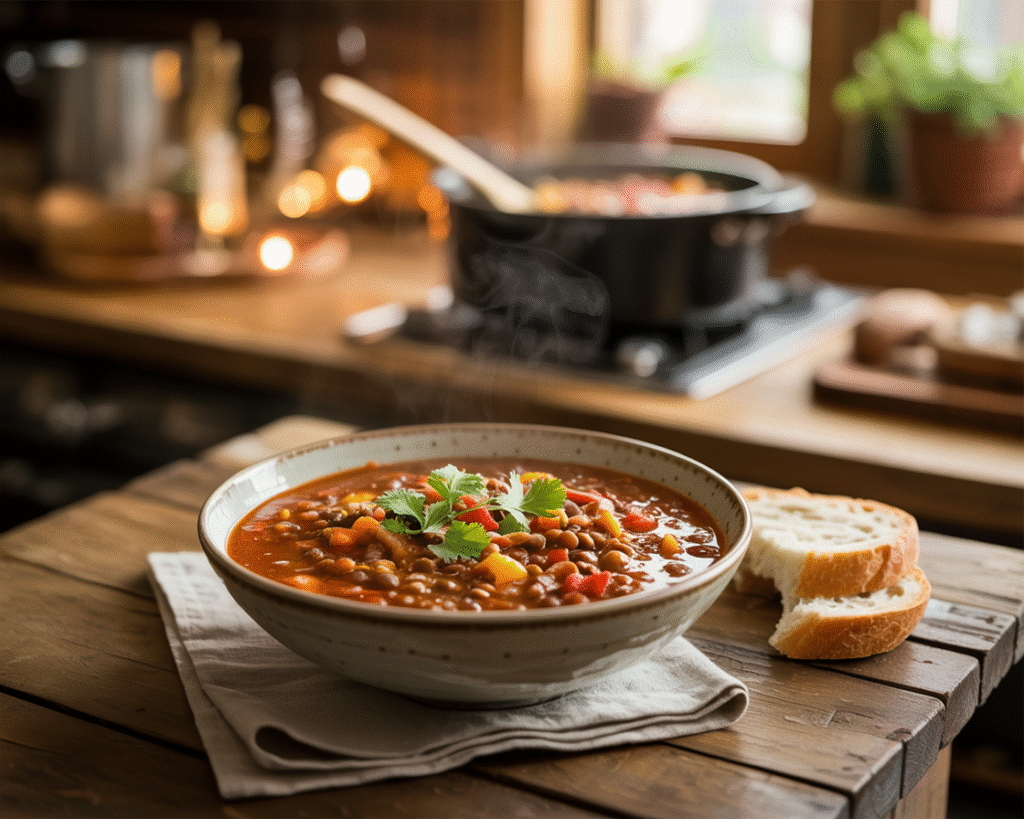 When the temperature drops, a bowl of thick, flavorful chili hits the spot like nothing else. This veggie-packed lentil chili is the kind of meal you’ll want on repeat all season long. It’s rich, gently spiced, and loaded with protein and fiber to keep you full for hours. No meat, no problem—lentils bring the hearty